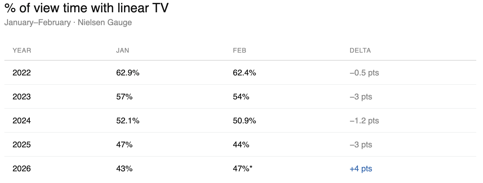 So - what did February numbers look like? The WSJ reported Nielsen’s findings showed linear’s share of view time at 48% in February - up 4-points over January. Four years of consistent January to February declines, and a sudden 4-pt jump is likely more aligned to methodology changes than behavioral ones.