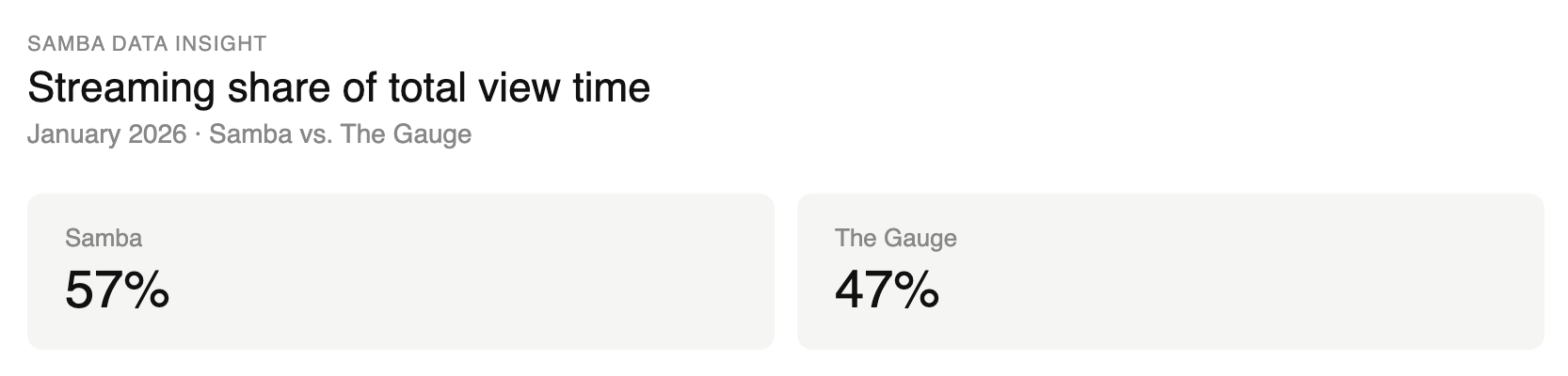 As you can imagine, these differences result in more than just a rounding error. In Jan 2026, The Gauge reported streaming share of view time as 47%. Samba reported 57%, a 10-point gap driven at least partially by the labels and categories we use in measurement.