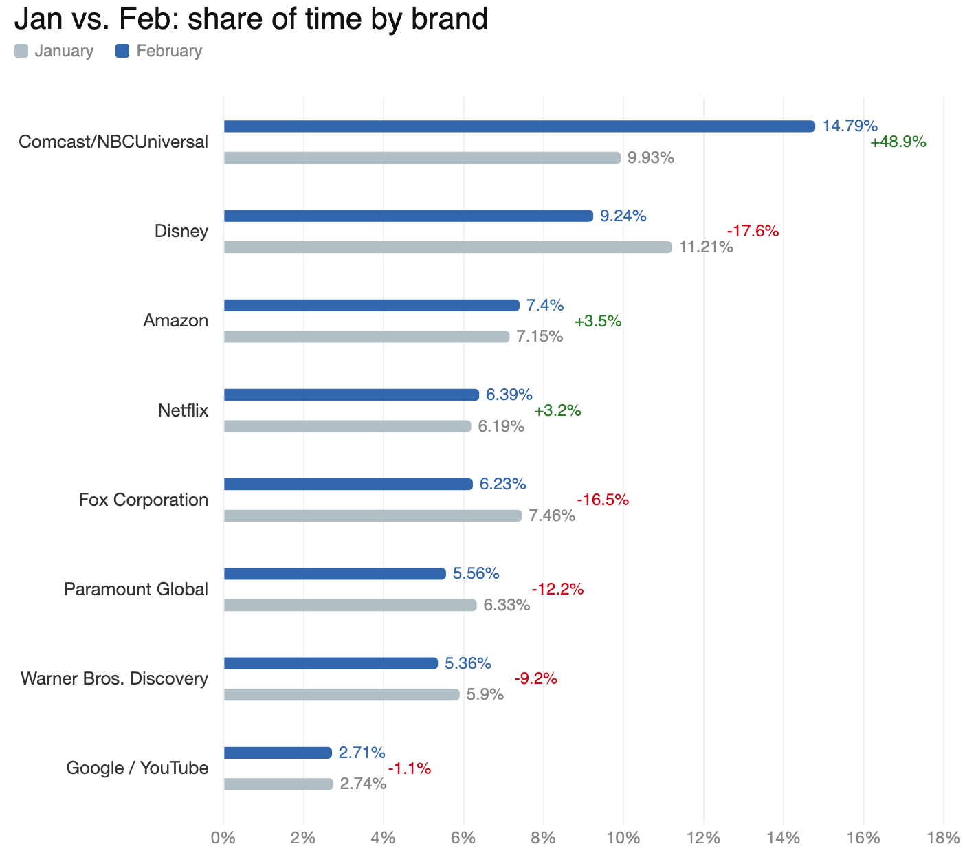 When we roll Samba’s February data up to the parent company level, Comcast / NBCU takes the top rank in view time Feb 2026, up by nearly 50% from January. That makes sense - NBCU owned February with Olympics coverage. The programming mattered more than the medium.