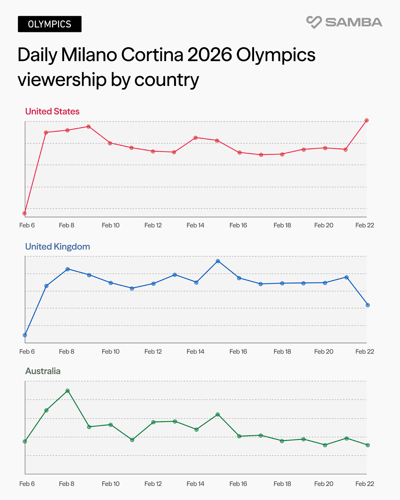 Across the U.S., U.K., and Australia, viewership followed a familiar tentpole pattern. There was a modest opening day on February 6th, then a solid first weekend of competition drew in fans who watched alpine skiing and figure skating, then a steady plateau through mid-February.
