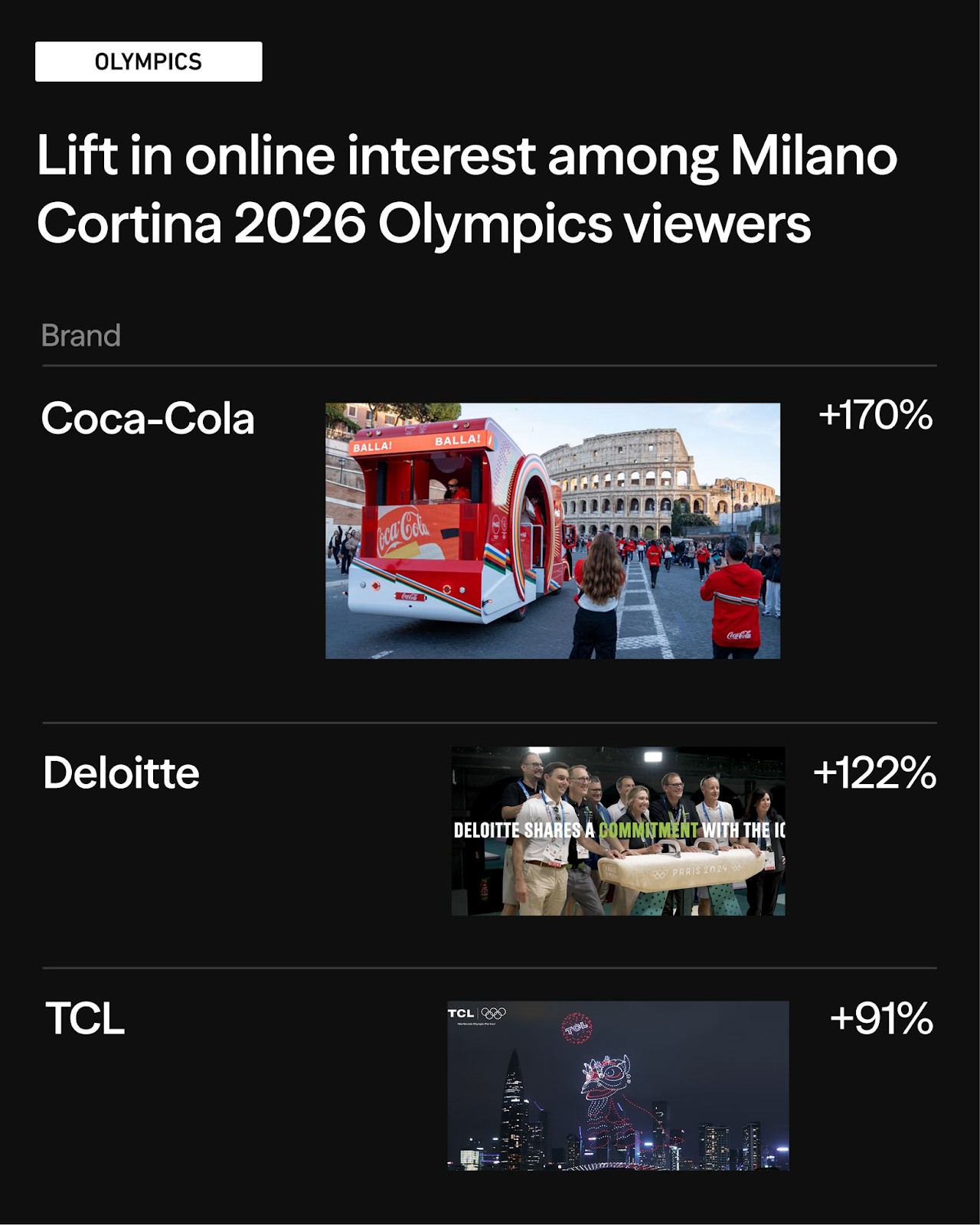 Impressions measure exposure. Web interest measures whether ad exposure drove interest. Three sponsors stood out. Coca-Cola saw online engagement among Olympics viewers jump from 12% before the Games to 34% after, a 170% lift. Deloitte followed with a 122% lift, and TCL posted a 91% lift. The takeaway mirrors what Samba has seen at other major events: sponsorship works best when it gives audiences a new reason to engage with a brand, not just remind them it exists.