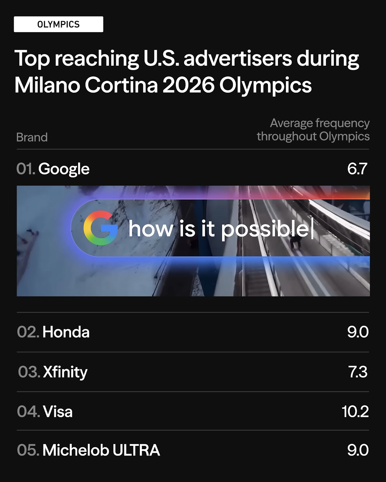 Two of the biggest U.S. Olympic TV advertisers took notably different approaches. Google led all brands in reach, connecting with more unique households than anyone else. Visa led in total impressions, reaching a smaller audience at a higher average frequency: 10.2x versus Google's 6.7x. Google prioritized breadth; Visa bet on repetition with a highly engaged audience.